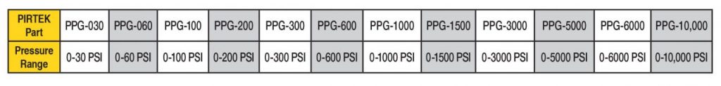 The PPG Series Gauges are 2.5 inch glycerin filled and available at your local PIRTEK.